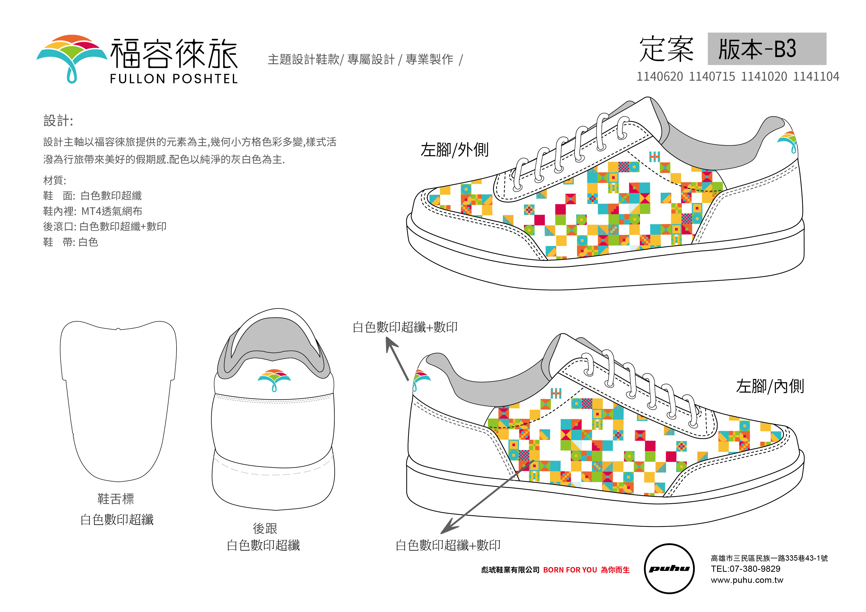鞋面以 幾何圖樣 為設計核心, 融合品牌色彩與活潑線條, 滾口細節低調配置 福容徠旅 LOGO, 在專業穩重中展現年輕與親和力, 兼具識別性與實穿性。