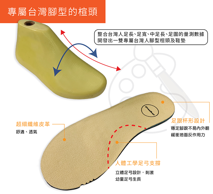 彪琥擁有30多年專業製鞋經驗,獨家開發符合台灣腳型的專屬楦頭,適合亞州人較寬腳型的鞋型設計,配置人體工學鞋墊,刺激足弓生長,提供完整支撐力,讓孩子的雙腳從小就可以被好好照顧,正常發展,減低扁平足及高弓足好發機率。
