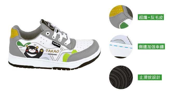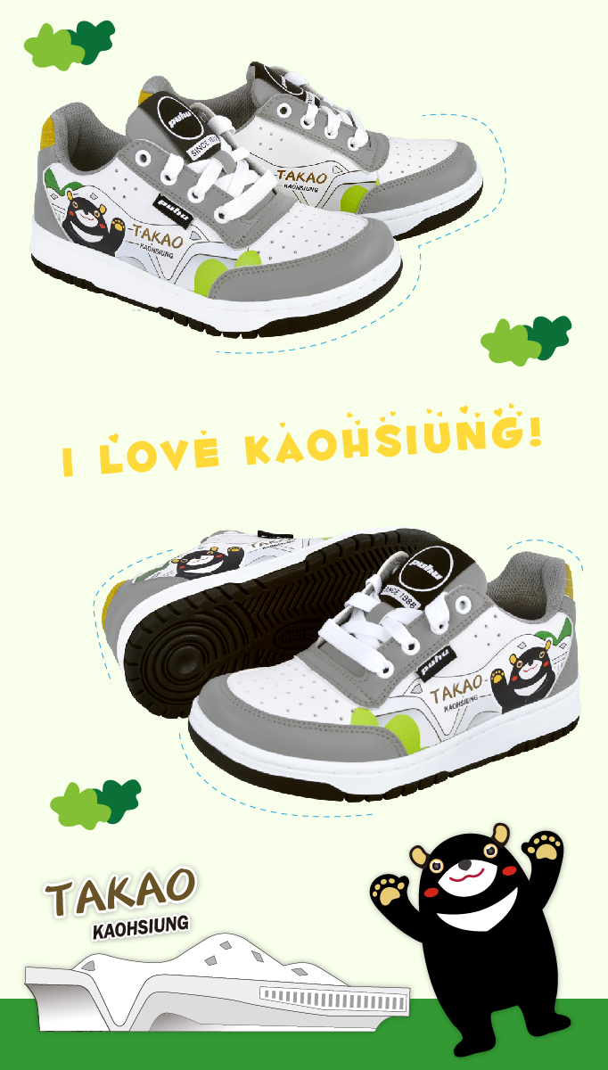 以高雄熊為主題設計,搭配高雄景點及人文風情為輔,童鞋採用活潑的配色及選用PUHU休閒鞋版型,鞋底止滑好穿且舒適,一起全家親子出遊,健康好生活。