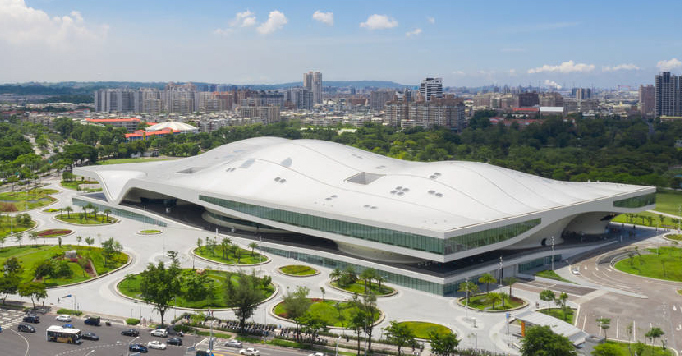 音波式的流線外型與白色波浪的自由曲線,以流暢的弧度滑入地面,與周遭環境巧妙結合。由荷蘭建築師法蘭馨・侯班以衛武營的老榕樹群為靈感設計,樹齡過百的榕樹群,盤根錯節、枝枒糾結,虛實互應的景象,開啟了建築師賦予衛武營具穿透感與呼吸節奏的想像,整棟建築物讓民眾能四面八方、毫無阻礙的走進場館,而由廳院屋頂延伸的通透空間,則是向眾人24 小時開放的榕樹廣場,民眾能夠自由穿梭其中、自在地活動與休憩。一座無圍欄的藝術中心,不僅有助於氣流流動,也創造了劇場與生活零距離的空間感。