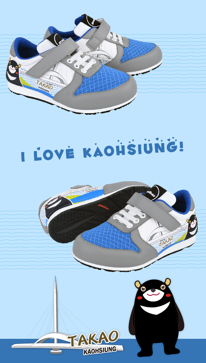 以高雄熊為主題設計,搭配高雄景點及人文風情為輔,童鞋採用活潑的配色及選用PUHU健走鞋版型,鞋底止滑好穿且舒適,一起全家親子出遊,健康好生活。