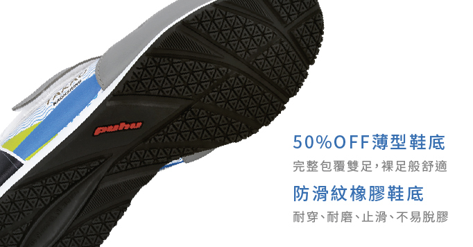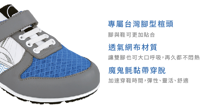 以台灣人腳型楦頭設計,鞋款包覆,貼合雙腳。透氣舒適的鞋面材料、吸汗乾爽的網布內裡,魔鬼氈黏帶可快速穿脫,雙腳可以靈活行動!