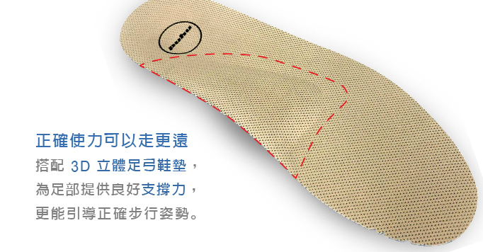 鞋內搭配彪琥三足弓支撐原理設計的3D立體足弓鞋墊,為足部提供良好支撐力,刺激腳底穴位,更能引導正確步行姿勢,鍛鍊正確肌肉,讓散步也可以達到強身健體的效果。
