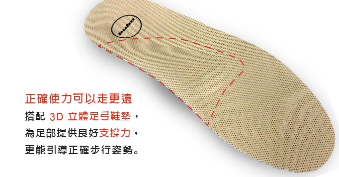 鞋內搭配彪琥三足弓支撐原理設計的3D立體足弓鞋墊,為足部提供良好支撐力,刺激腳底穴位,更能引導正確步行姿勢,鍛鍊正確肌肉,讓散步也可以達到強身健體的效果。