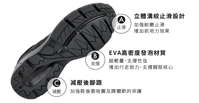橡膠大底耐磨防滑,維護行走時的安全,不易磨損,耐用度十足。