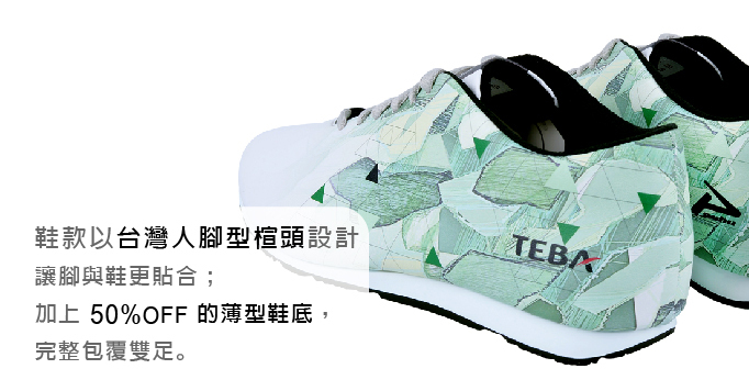 這雙專為TEBA設計的鞋款,以「環保永續」為概念。讓鞋子成為個人生活主張及態度,有意識的新選擇。