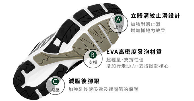 EVA超輕量一體成型橡膠鞋底,立體溝紋止滑設計,加強止滑耐磨,增加抓地力;EVA高密度發泡材質,增加行走助力,支撐腳部核心;鞋後跟加強吸震效果,幫助減壓,保護後腳跟及踝關節。