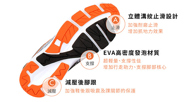 EVA超輕量一體成型橡膠鞋底,立體溝紋止滑設計,加強止滑耐磨,增加抓地力EVA高密度發泡材,增加行走助力,支撐腳部核心;鞋後跟加強吸震效果,幫助減壓保護後腳跟及踝關節