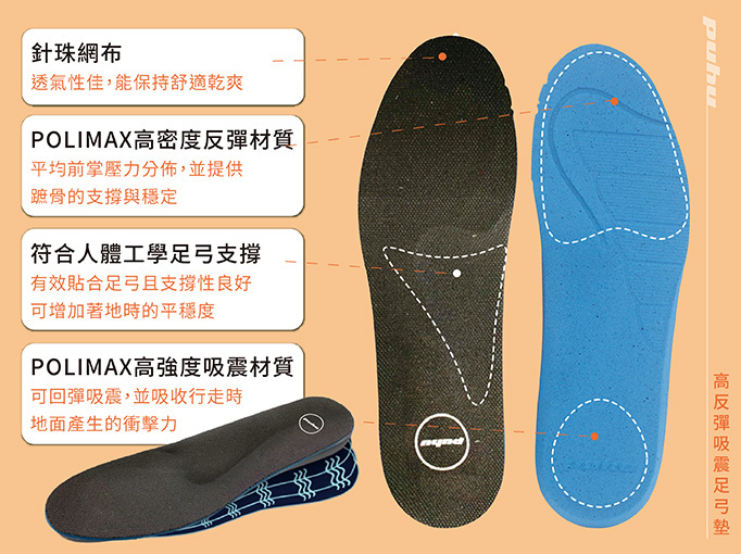 符合人體工學設計的三足弓支撐鞋墊,可平均分散足部壓力,達到更舒適的體驗。POLIMAX材質,具高密度反彈功能,平均前掌壓力分佈,並提供蹠骨支撐及穩定性;同時兼具高強度吸震回彈功能,可以吸收後腳跟行走於地面時所產生的衝擊力。針珠網布材質,有絕佳透氣性,保持絕對舒適乾爽。