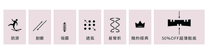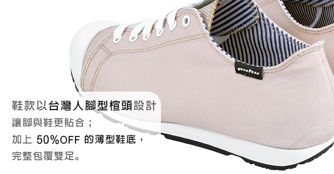 鞋款以台灣人腳型楦頭設計,讓腳與鞋更貼合;透氣舒適的鞋面布料,加上50% OFF的薄型鞋底,完整包覆雙足,模擬裸足的舒適感受,行走時更輕鬆自在。穿上鞋子出門一整天都有好心情!