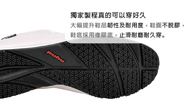 彪琥獨家創新製程,大幅提升鞋品韌性及耐用度,鞋面不脫膠,鞋底採用橡膠底,止滑耐磨耐久穿,一雙真的可以穿好久!