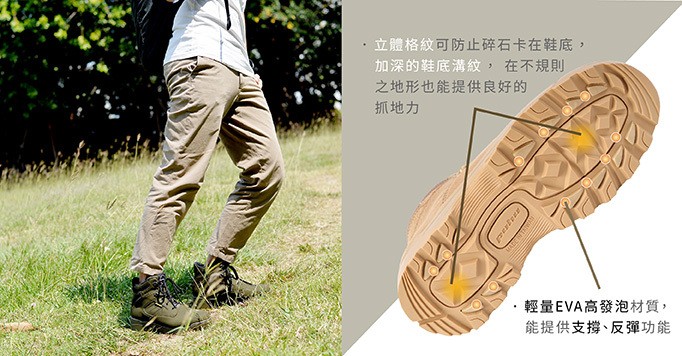 鞋底採用立體大格紋止滑設計,可防止泥濘及碎石卡在鞋底裡,加深的溝紋紋路,在不規則地形也能提供卓越的抓地力。