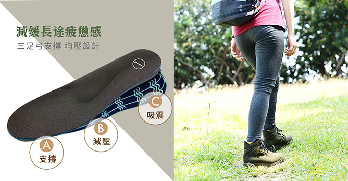 三足弓支撐鞋墊平均足底壓力,給予雙腳支撐力。鞋底材質輕量且彈性佳,可增加行走助力並支撐腳部核心,後跟處加強吸震及保護腳踝的效果,可減緩登山時雙腳疲憊的感受。