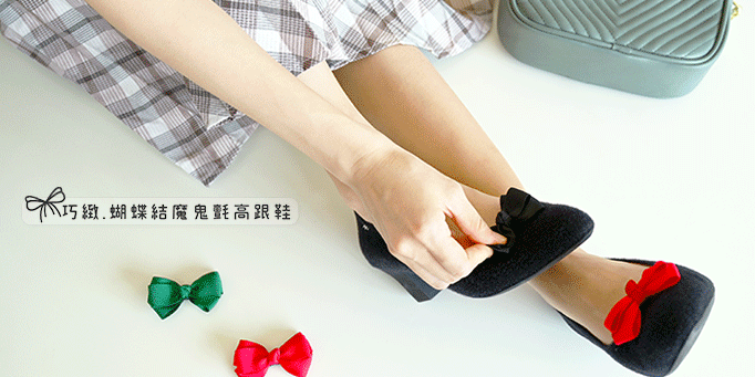 在黑色的高跟鞋上,綴上蝴蝶結,創造一整天的愉悅心情。凡購買蝴蝶結魔鬼氈高跟鞋1雙,即贈2組立體精緻蝴蝶結(黑色及寶藍色)。鞋面使用特殊設計魔鬼氈布,柔順不刮手,自由黏貼,重複使用,多變趣味。
