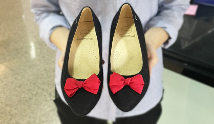 蝴蝶結魔鬼氈高跟鞋使用新型製作方式「無膠成型法」,鞋面與鞋底不使用膠水接著,而是直接車縫一體成型;從今往以後不需要擔心鞋子脫膠開口笑的出糗情節,更優雅、更耐穿、更環保。