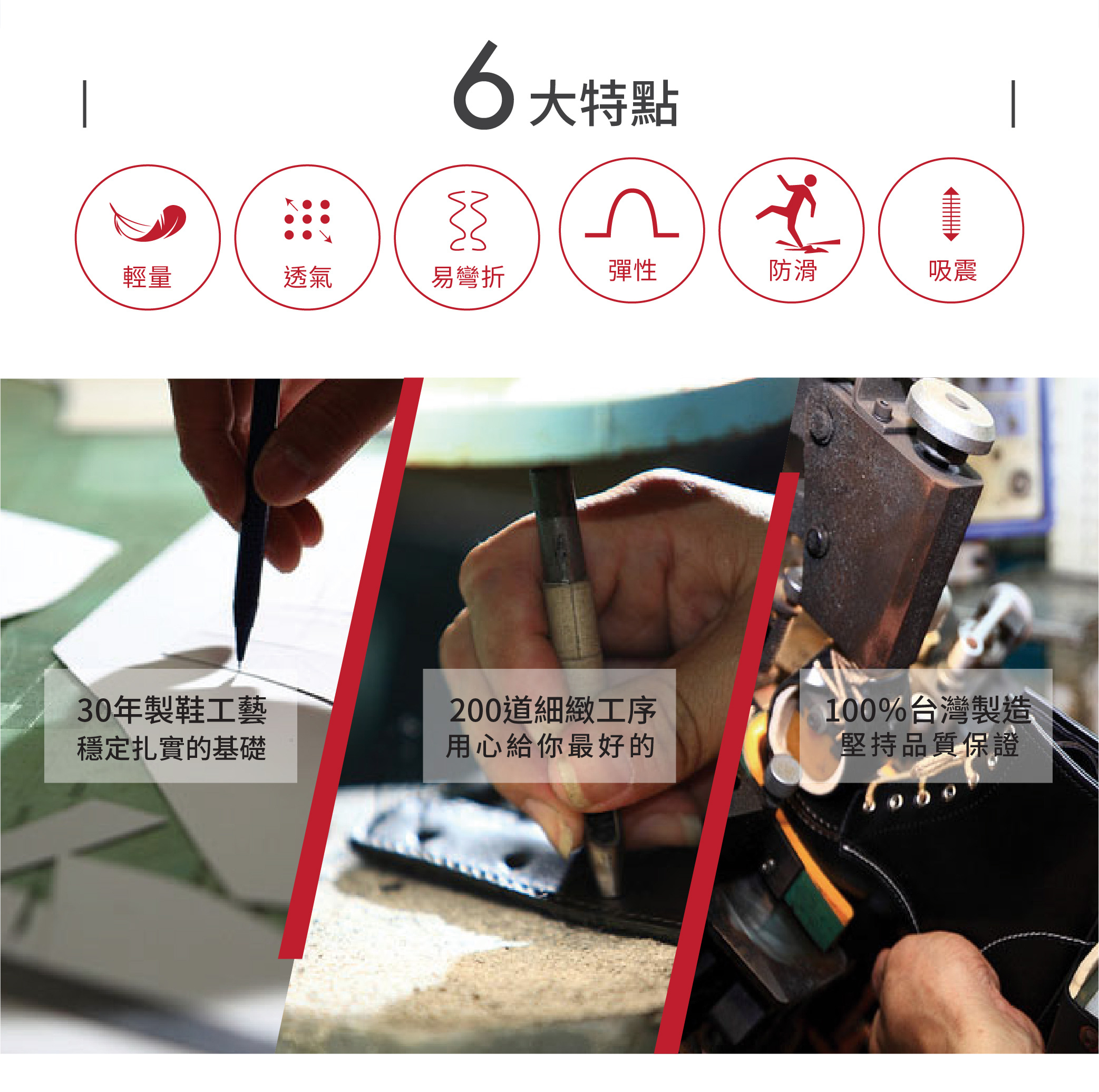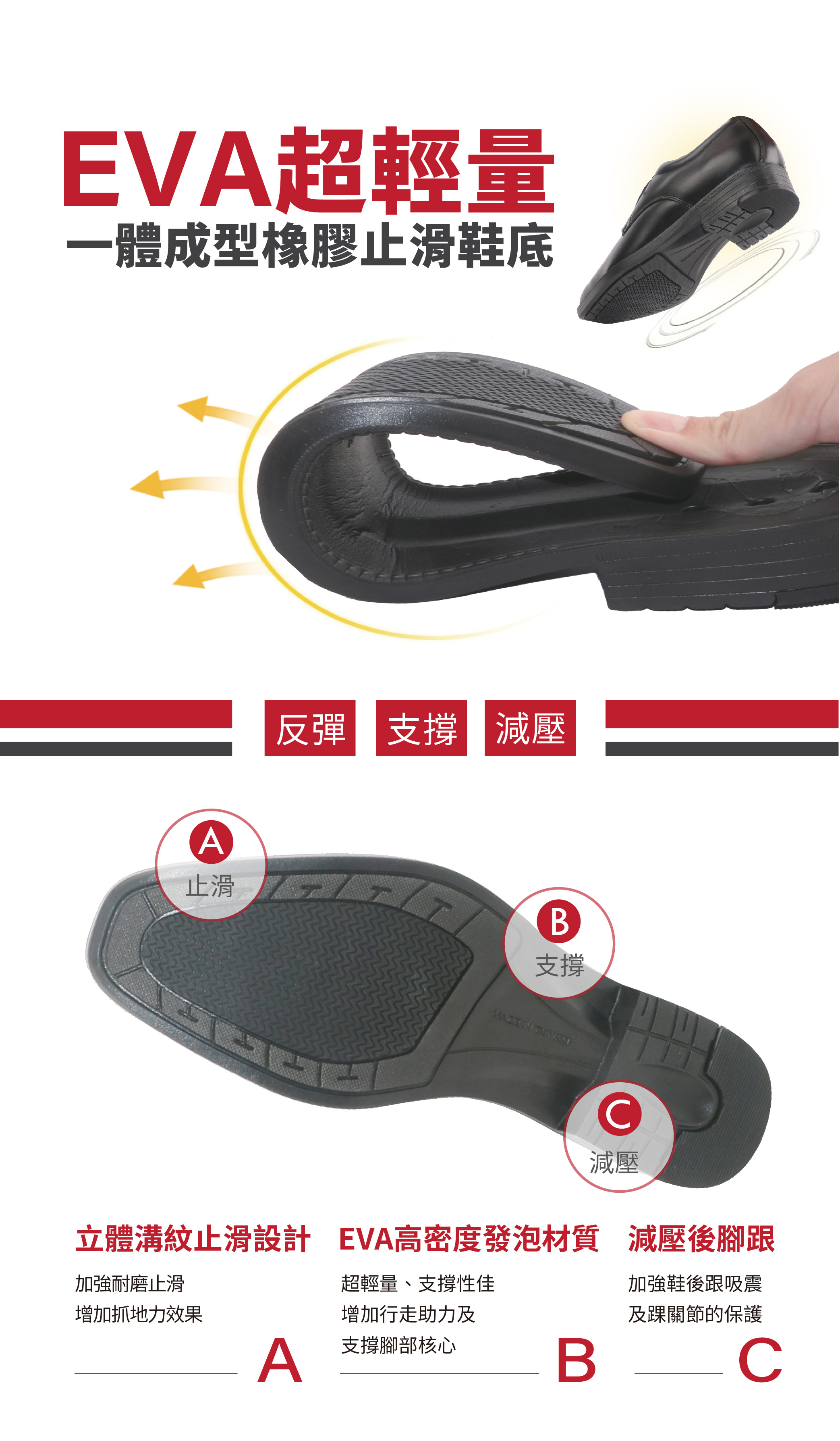 *輕量高密度EVA搭配橡膠片的一體成型鞋底,防滑與耐磨效果好,且耐用度高