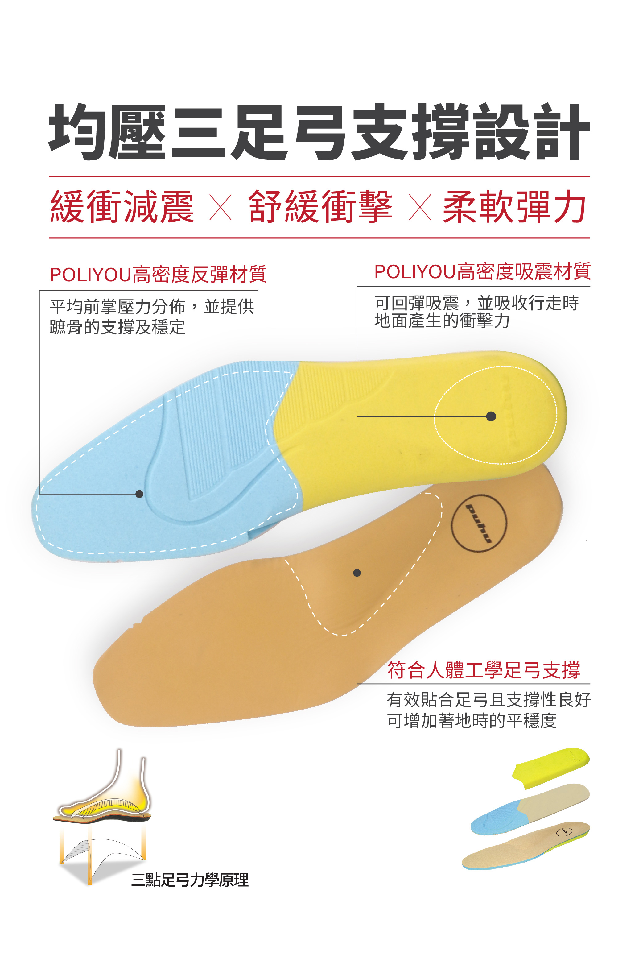 *3D腳型足弓支撐鞋墊,提供「反彈、吸震、均壓、平衡」的效果