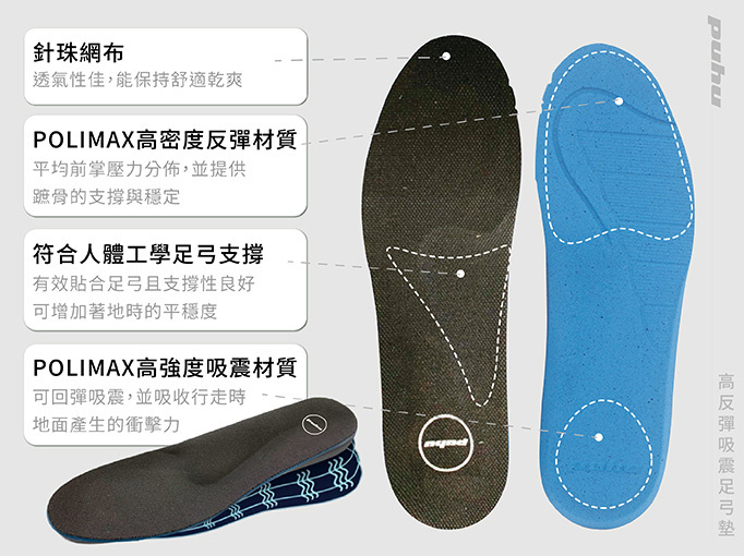 符合人體工學設計的三足弓支撐鞋墊,可平均分散足部壓力,達到更舒適的體驗。POLIMAX材質,具高密度反彈功能,平均前掌壓力分佈,並提供蹠骨支撐及穩定性;同時兼具高強度吸震回彈功能,可以吸收後腳跟行走於地面時所產生的衝擊力。針珠網布材質,有絕佳透氣性,保持絕對舒適乾爽。