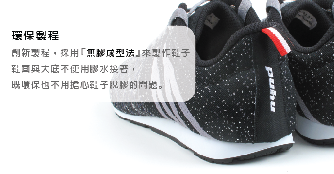 創新製程,採用『無膠成型法』來製作鞋子 , 鞋面與大底不使用膠水接著,既環保也不用擔心鞋子脫膠的問題。