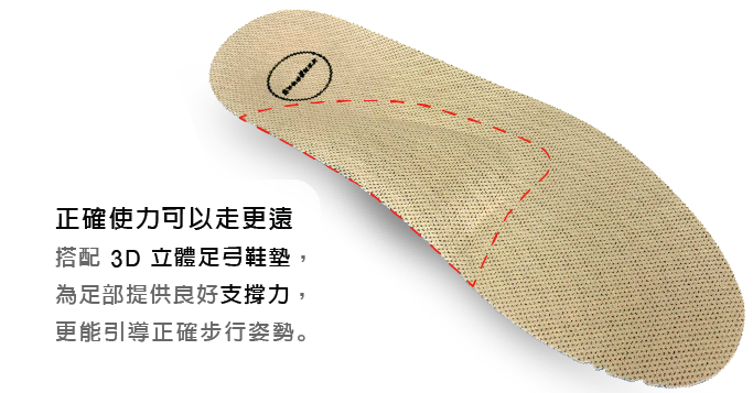 鞋內搭配彪琥三足弓支撐原理設計的3D立體足弓鞋墊,為足部提供良好支撐力,刺激腳底穴位,更能引導正確步行姿勢,鍛鍊正確肌肉,讓散步也可以達到強身健體的效果。
