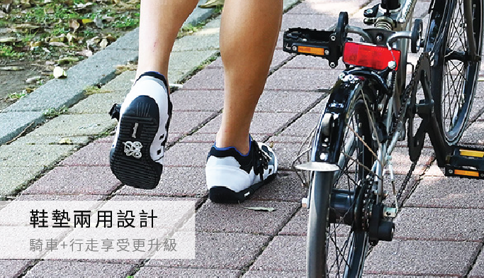 鞋底專利溝紋設計,不需上卡也可以密合單車踏板;平底設計,輕鬆上下車,可以騎車又可以散步,看你的心情來決定。