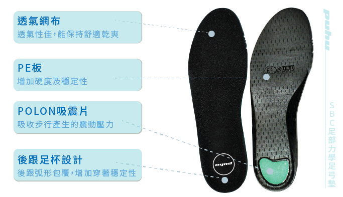 SBC足部力學足弓墊,人體工學足弓設計,提供雙腳滿滿支撐力,後跟配置POLON吸震設計,行走時舒適輕鬆,不疲憊,享受更升級。