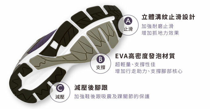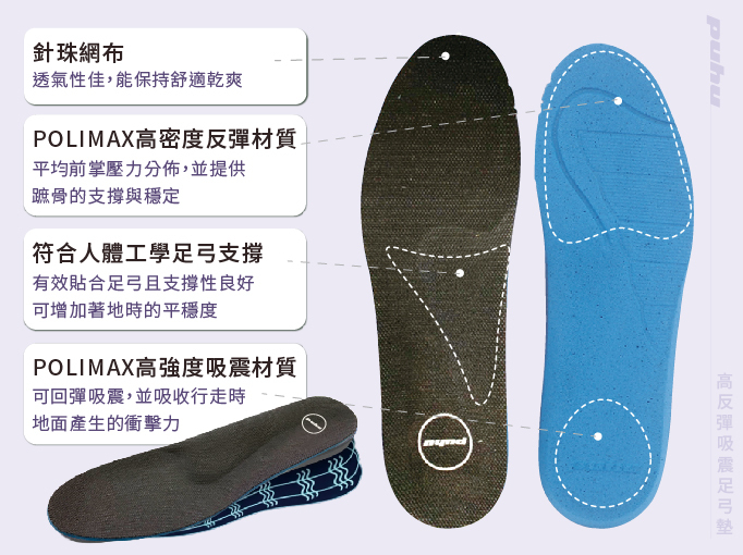 符合人體工學設計的三足弓支撐鞋墊,可平均分散足部壓力,達到更舒適的體驗。POLIMAX材質,具高密度反彈功能,可平均前掌壓力分佈,並提供蹠骨支撐及穩定性;同時兼具高強度吸震回彈功能,可以吸收後腳跟行走於地面時所產生的衝擊力。針珠網布材質,有絕佳透氣性,保持絕對舒適乾爽。