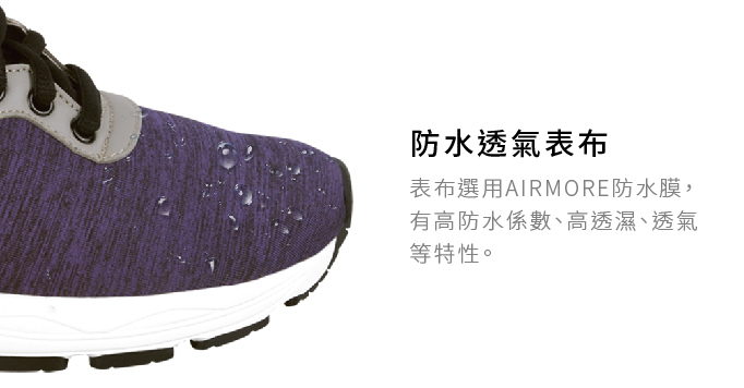 鞋面防水透氣表布選用AIRMORE防水膜,有高防水係數、高透濕、透氣等特性,為腳部帶來絕佳的乾爽舒適,是通勤、旅遊、日常休閒的必備好物,晴天、雨天都好穿!