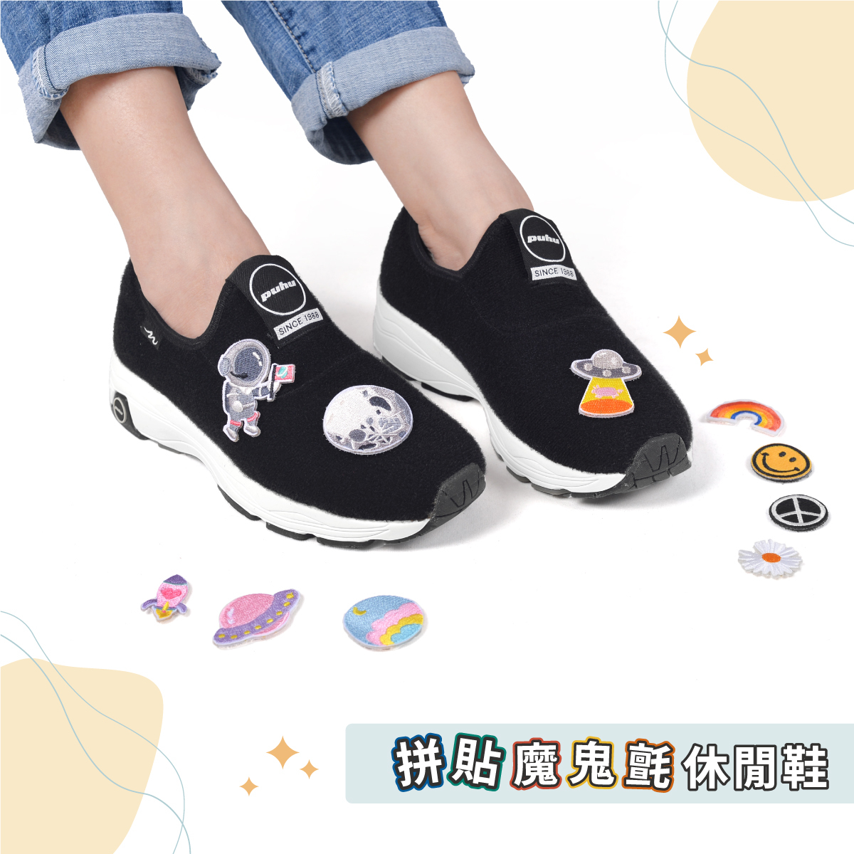鞋面上的任何角落都可妝點,素面是經典百搭,貼上更是個性風格,獨一無二的時尚足跡由你來定義。