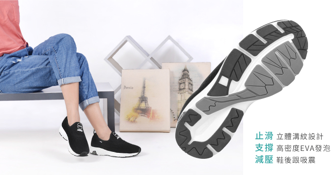 超輕量EVA一體成型橡膠止滑底,立體溝紋設計,加強耐磨止滑,增加抓地力效果。EVA高密度發泡材質,超輕量、支撐性佳,增加行走助力並支撐足部核心。