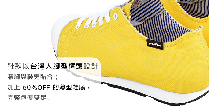 鞋款以台灣人腳型楦頭設計,讓腳與鞋更貼合;透氣舒適的鞋面布料,加上50% OFF的薄型鞋底,完整包覆雙足,模擬裸足的舒適感受,行走時更輕鬆自在。穿上鞋子出門一整天都有好心情!