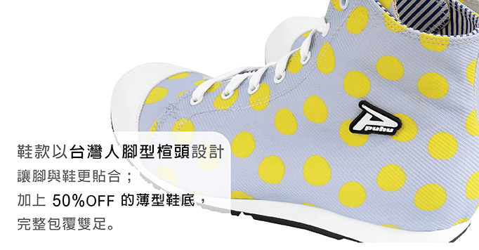 鞋款以台灣人腳型楦頭設計,讓腳與鞋更貼合;透氣舒適的鞋面布料,加上50% OFF的薄型鞋底,完整包覆雙足,模擬裸足的舒適感受,行走時更輕鬆自在。穿上鞋子出門一整天都有好心情!