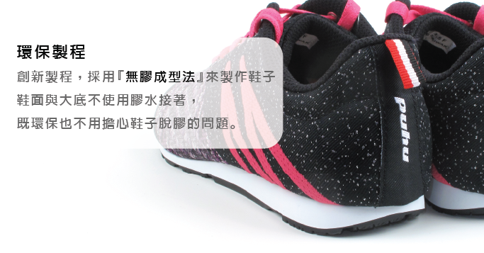 創新製程,採用『無膠成型法』來製作鞋子 , 鞋面與大底不使用膠水接著,既環保也不用擔心鞋子脫膠的問題。