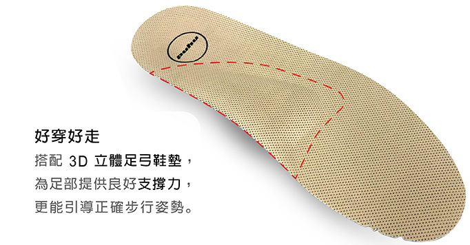 鞋內搭配彪琥三足弓支撐原理設計的3D立體足弓鞋墊,為足部提供良好支撐力,引導正確步行姿勢,鍛鍊肌肉,可以走得更遠更輕鬆!