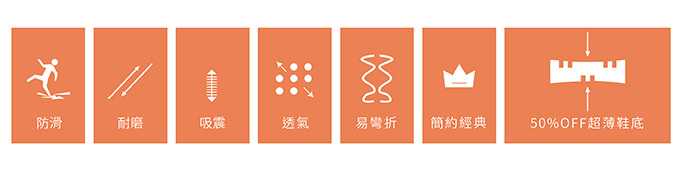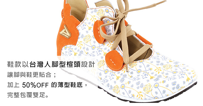 鞋款以台灣人腳型楦頭設計,讓腳與鞋更貼合;50% OFF的薄型鞋底,模擬裸足的舒適感受,享受步行的愜意與自在!