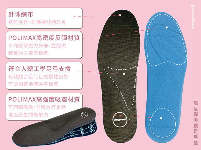 符合人體工學設計的三足弓支撐鞋墊,可平均分散足部壓力,達到更舒適的體驗。POLIMAX材質,具高密度反彈功能,可平均前掌壓力分佈,並提供蹠骨支撐及穩定性;同時兼具高強度吸震回彈功能,可以吸收後腳跟行走於地面時所產生的衝擊力。針珠網布材質,有絕佳透氣性,保持絕對舒適乾爽。