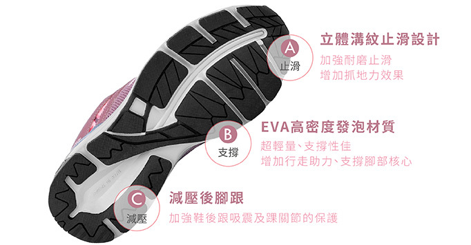 EVA超輕量一體成型橡膠鞋底,立體溝紋止滑設計,加強止滑耐磨,增加抓地力;EVA高密度發泡材質,增加行走助力,支撐腳部核心;鞋後跟加強吸震效果,幫助減壓,保護後腳跟及踝關節。